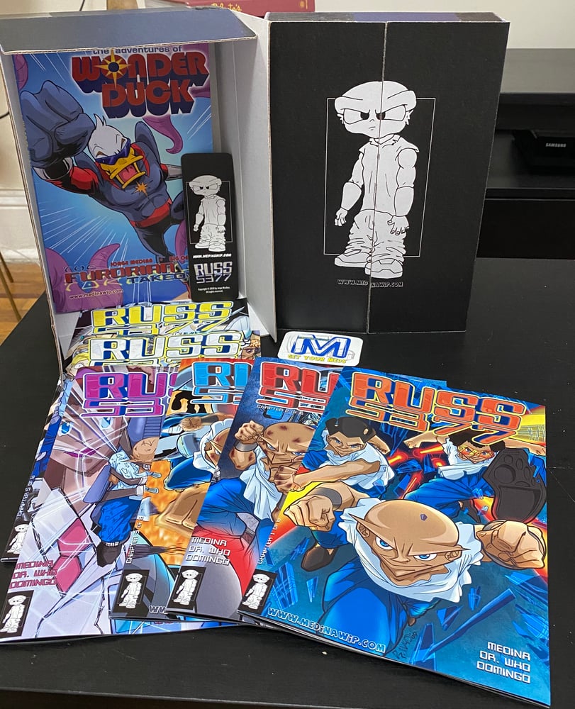 For the first time and for a limited time, all 6 chapters of the Russ5377 original series are printed and available. The Box set includes issues 1-6 in black and white, 6" X 10" prints of all of the covers, Russ5377 and Street Journal bookmark (two sided), a #getyourmeds sticker and a signed copy of the 88 page graphic novel The Adventures of Wonder Duck: The Furorian Takeover Part 1. ($76.00 Value)